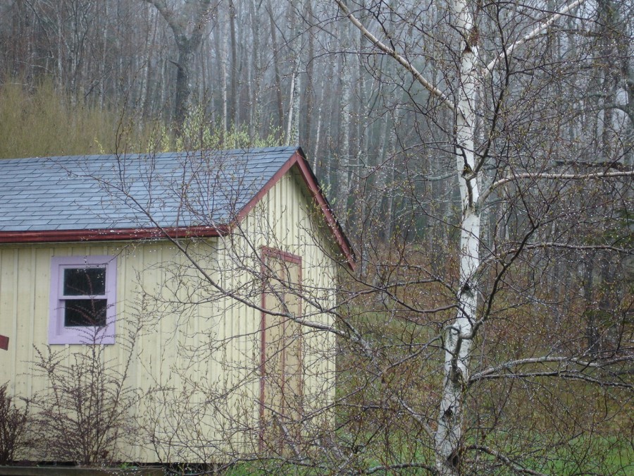 - Quirky but intentional lilac colour on shed window frame.